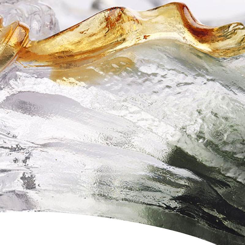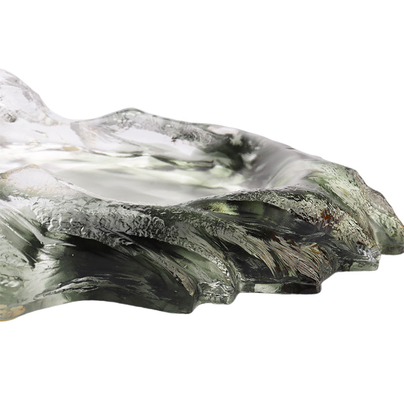 Denne fruktfaten i glass er omhyggelig laget med den eldgamle tapte voksmetoden. Fruktfatet er i form av en oval tallerken, med bølgende mørkegrønne fjell som danner tallerkenkroppen. Fargen er dyp og stille, som om den kondenserer dybden og mystikken til fjellene og skogene.